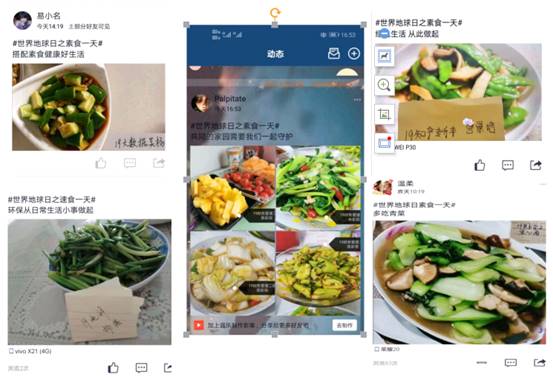 4月22日“低碳素食一天”活动开展,活动号召大家进行“素食”行动,从舌尖上为保护大自然、保护生物多样性做出自己的贡献。参与者们在QQ空间参与#世界地球日之素食一天#的话题讨论,并且晒出自己的当天的素食。